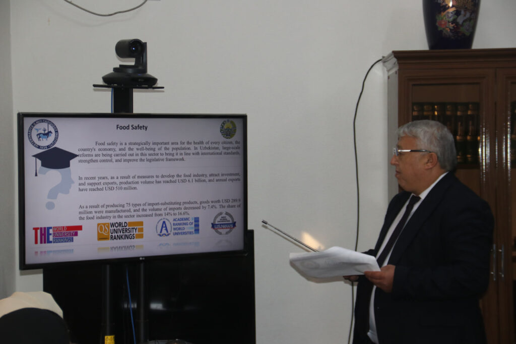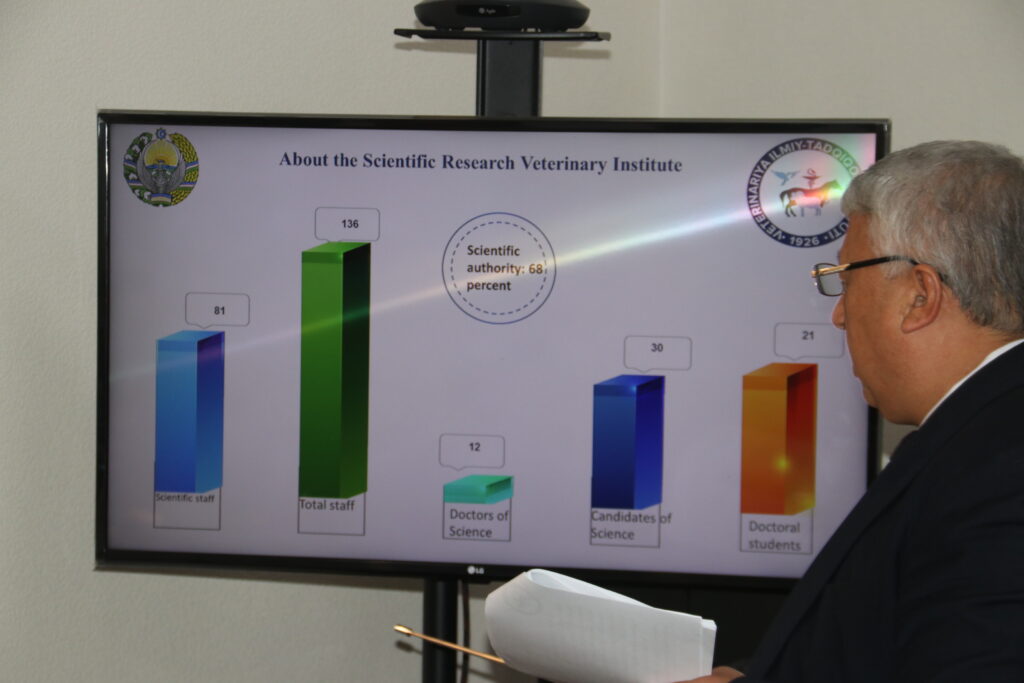 Shundan so‘ng, institutning yetakchi olimi, professor B.Elmurodov tomonidan “Veterinariya ilmiy-tadqiqot institutining faoliyati va so‘nggi yillardagi yutuqlari” mavzusida taqdimot o‘tkazildi. Professor institutda amalga oshirilayotgan ilmiy loyihalar, parazitar va yuqumli kasalliklarga qarshi innovatsion preparatlar yaratish borasidagi natijalar hamda xalqaro miqyosda erishilgan muvaffaqiyatlar haqida so‘z yuritdi.