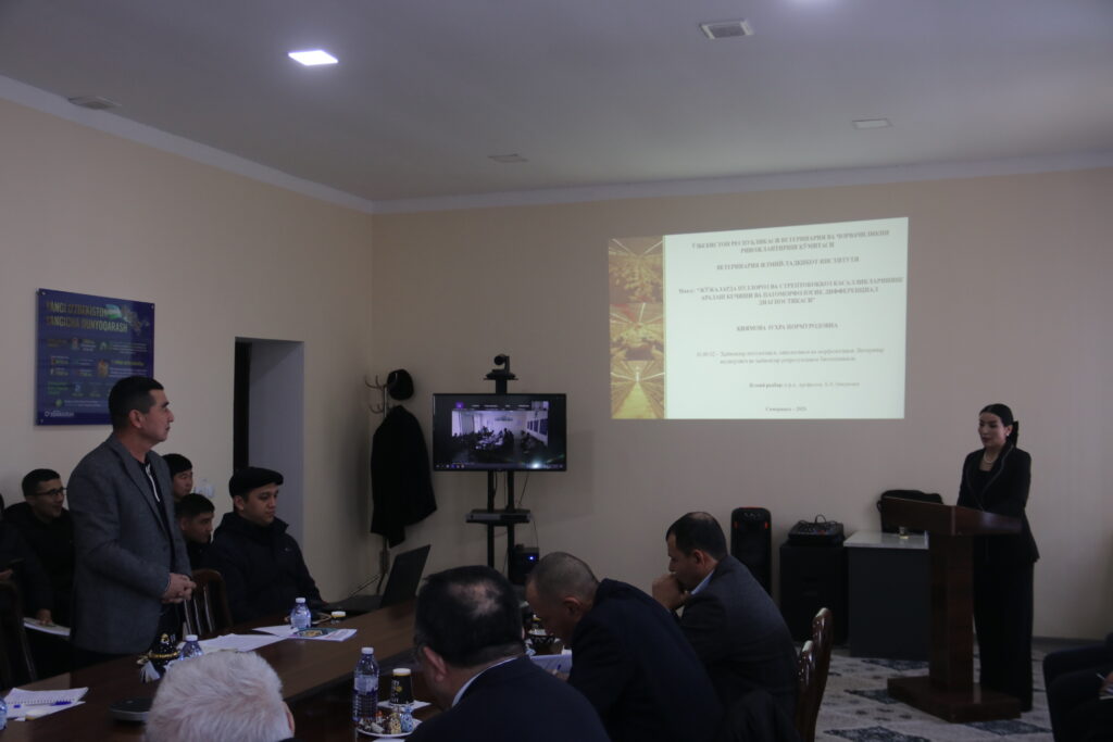 Ushbu navbatdagi yig’ilishda Veterinariya ilmiy-tadqiqot instituti mustaqil izlanuvchisi Kiyamova Zuxra Normuratovnaning «Jo‘jalarda pulloroz va streptokokkoz kasalliklarning aralash kechishi va potomorfologik defferinsial diagnostikasi» mavzusidagi 16.00.02 – “Hayvonlar patologiyasi, onkologiyasi va morfologiyasi. Veterinar akusherligi va hayvonlar reproduksiyasi biotexnikasi” ixtisosligi bo‘yicha veterinariya fanlari bo‘yicha falsafa doktori (PhD) ilmiy darajasini olish uchun tayyorlangan dissertatsiya taqdimoti tinglandi.