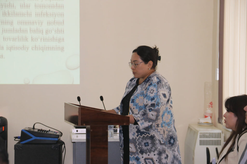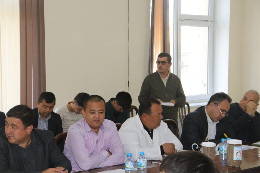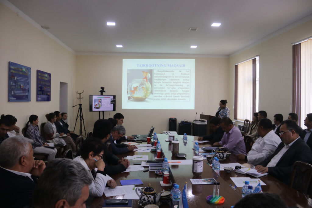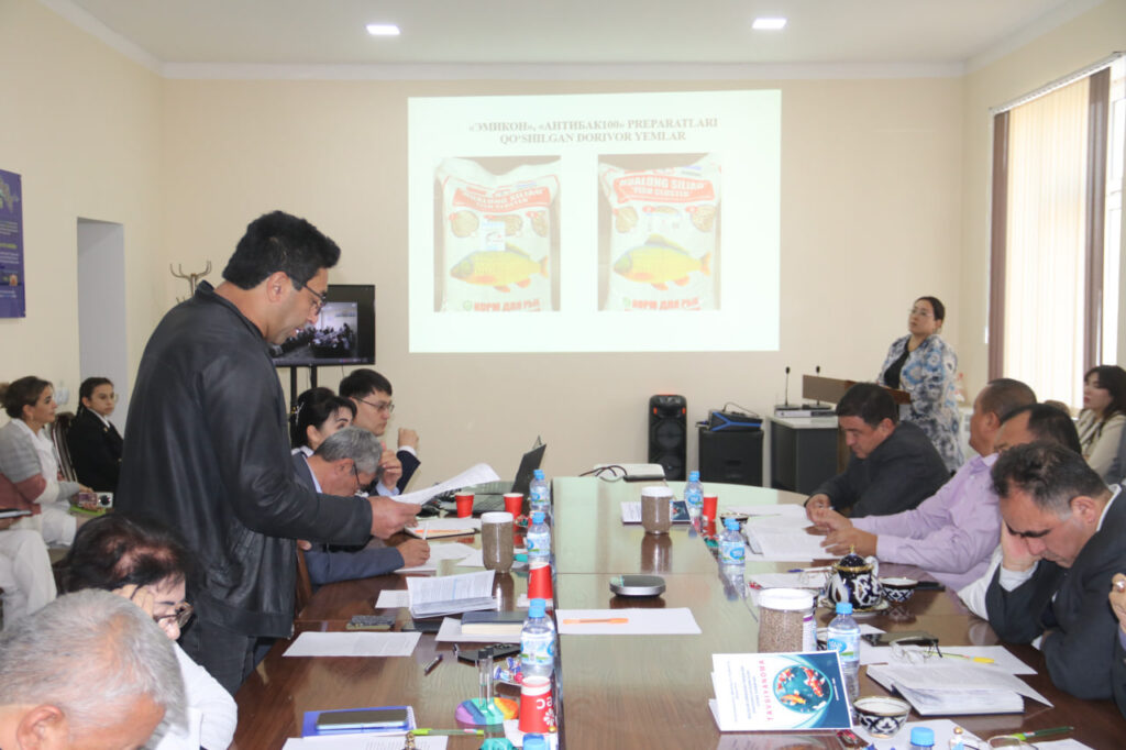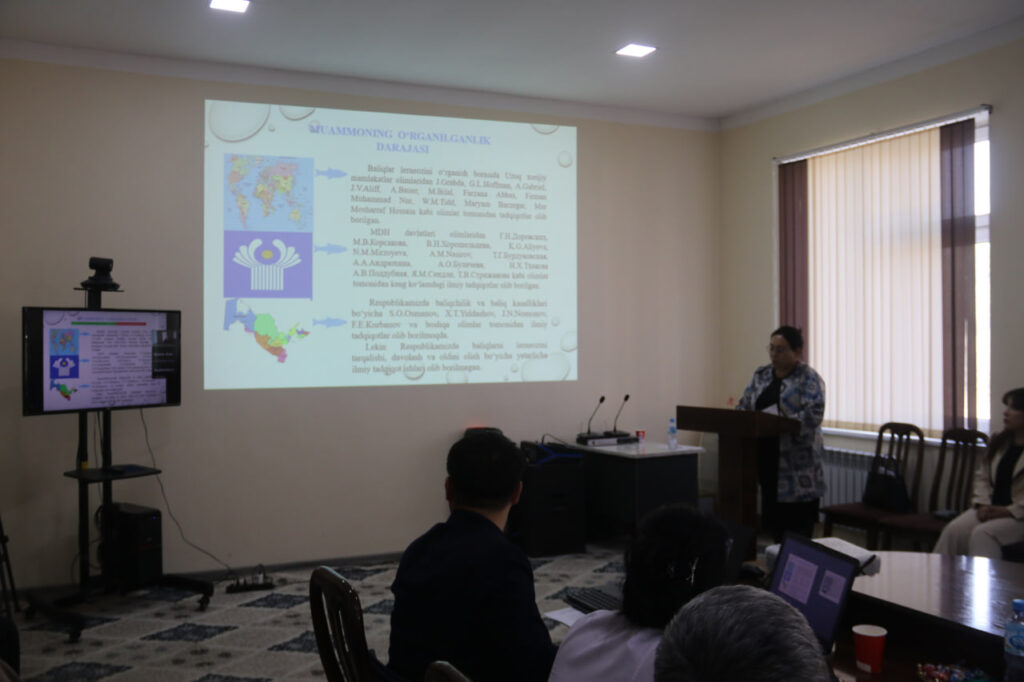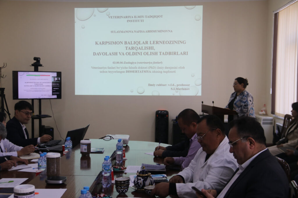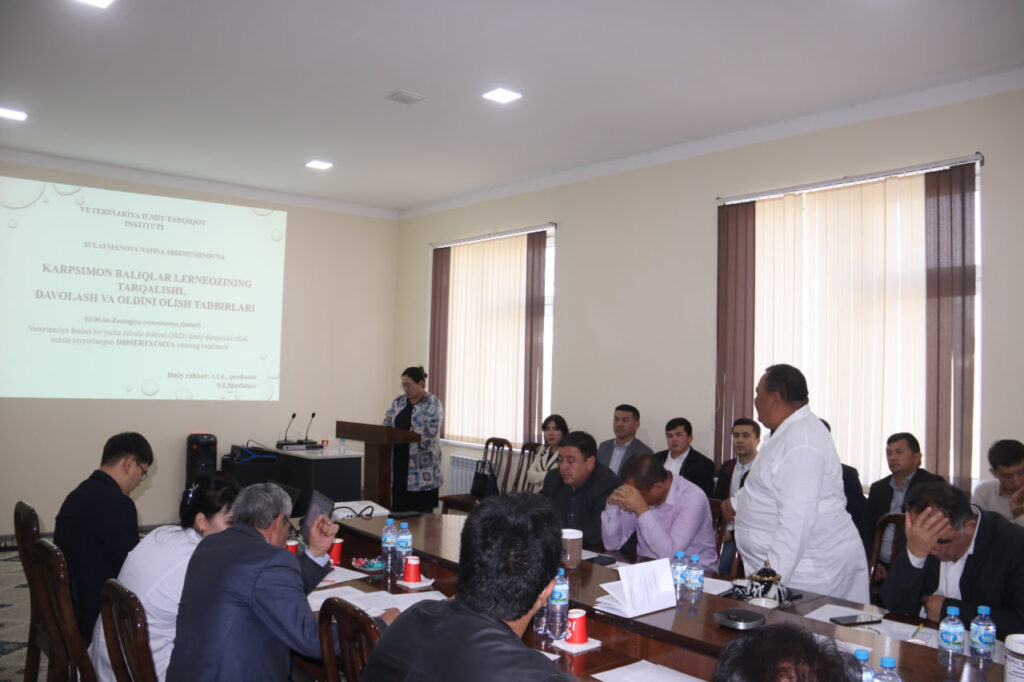 Yigʻilishda Veterinariya ilmiy-tadqiqot instituti tayanch doktoranti Sulaymonova Nafisa Abdimuminovnaning “KARPSIMON BALIQLAR LERNEOZINING TARQALISHI, DAVOLASH VA OLDINI OLISH TADBIRLARI” mavzusidagi veterinariya fanlari bo‘yicha falsafa doktori (PhD) ilmiy darajasini olish uchun yozilgan dissertatsiya ishi muhokamasi tugagach mavzu yuzasidan tadqiqotchiga savollar berildi va qoniqarli tarzda javoblar olindi.