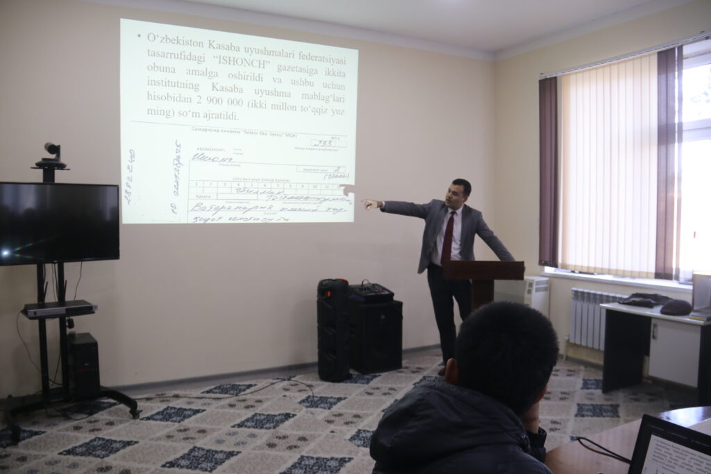 •Ma’lumot o‘rnida aytib o‘tmoqchimanki, har birimizdan ushlanib qolinayotgan Kasaba uchun 1% ushlanmadan maksimal foydalanish lozim, uni sizning roziligingizsiz va institutning Kasaba uyushma qo‘mitasi xulosasisiz hech kim foydalanishiga haqqi yo‘q, har bir xodim oxirgi uch yilda muqum ishlasa va kasabaga a’zo bo‘lsa har ikki yilda dam olish sanatoriyalariga imtiyozli yo‘llanmalar olishga haqli, yo‘llanmalardan tashqari institut hisob raqamiga tushgan umumiy mablag‘ning 25% ma’daniy ommaviy tadbirlarga, 35% Xodimlarga moddiy yordam, 10% tashkilotda sportni rivojlantirishga, 20% Kasaba uyushmasi faollarini rag‘batlantirishga, 10% idoraviy ishlarga (kerakli ashyolar, xo‘jalik mollari, KUQ a’zolarini rag‘batlantirish va boshqalarga ishlatilishi o‘rni kelsa ushbu foizlar uyushma a’zolari fikrlari bilan o‘zgartirilishi mumkin.